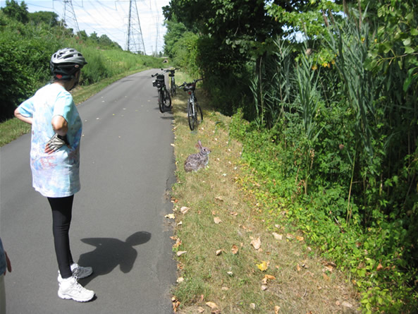 If you look carefully, you can see the "Grizzly," sitting on the rock, that caused Dan to lose control. If I didn't know better, I could swear that rabbit had a smile on it's face. Feeling rather brazen, the "Grizzly" made it's way back up the hill to intimidate other bikers on the trail, but Nilda would have none of it.